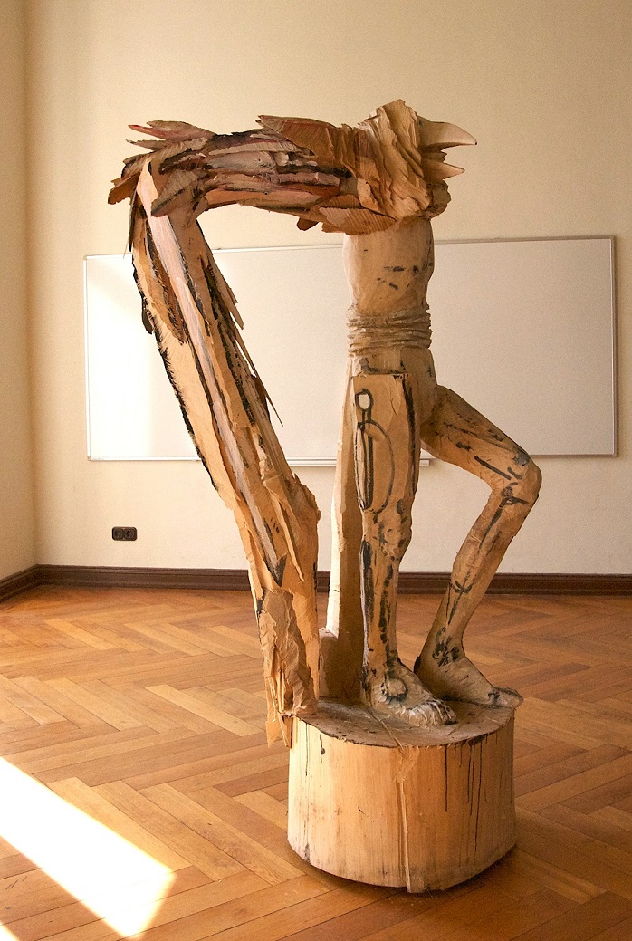 Die Hallenser Bildhauerin Julia Schleicher erhielt den Preis für ihre stehende Flügelgestalt Animalicus (Pappelholz, 180 cm), die sie während des zweiten Trebnitzer Pleinairs 2014 geschaffen hat.